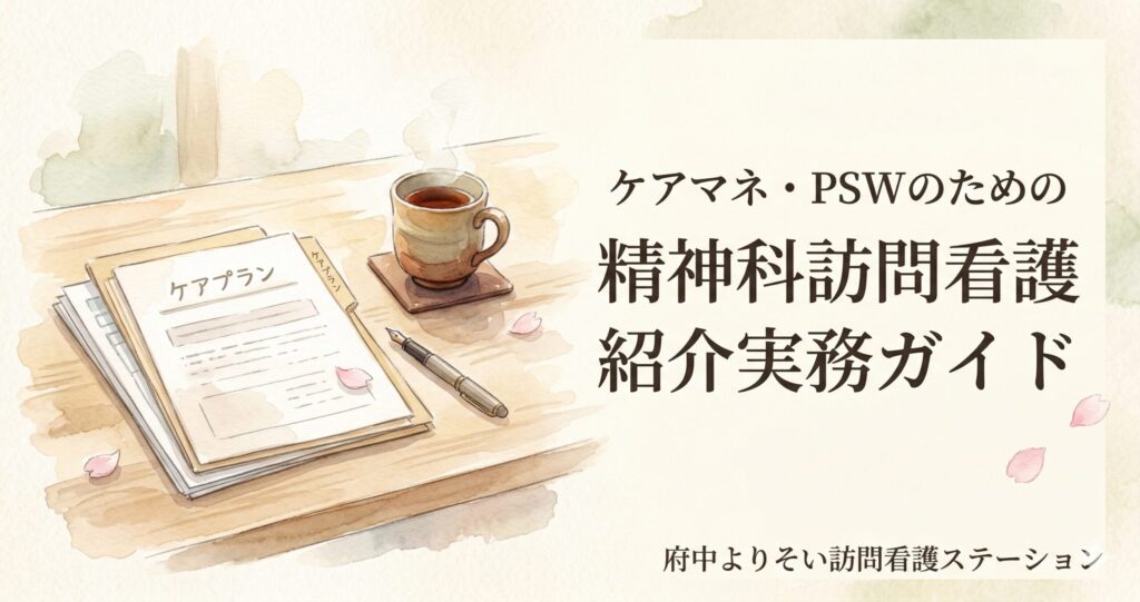 この記事では、府中市で精神科に力を入れている訪問看護を運営する立場から、ケアマネジャー・精神保健福祉士(PSW)・相談支援専門員の皆さまに向けて、精神科訪問看護への紹介をスムーズに進めるための実務ポイントをまとめます。