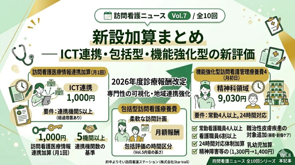 2026年の診療報酬改定では、訪問看護ステーションの専門性と機能をより細かく評価するための新しい加算が複数設置されました。これらの加算は、単なる報酬の上乗せではなく、高度な医療ニーズへの対応、地域連携の強化、特定の疾患に対する専門的な対応を評価するものです。本記事では、これら新設加算の詳細と、訪問看護ステーションがこれらの加算を取得するための要件、そして経営面での意義を解説します。