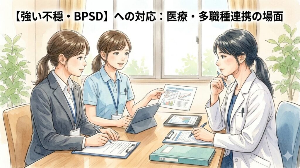 ・周囲との連携と環境調整: 不穏の引き金(トリガー)を分析し、ケアマネジャー様やご家族、他サービス事業所様と「共通の対応方針」を共有します。周囲が連携して一貫した関わりを持つことで、ご本人の安心感を高め、症状の沈静化を図ります。