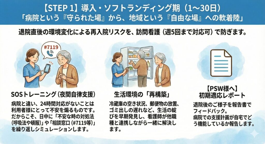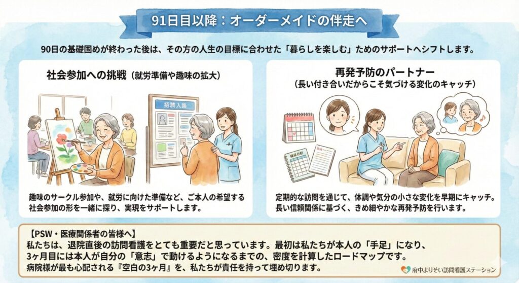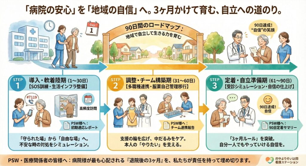 退院直後の90日間は、生活が最も不安定になりやすい時期です。府中よりそい訪問看護ステーションでは、この期間を3つのフェーズに分け、ただ訪問するだけでなく**「地域で自立して生きる力」**を段階的に育みます。