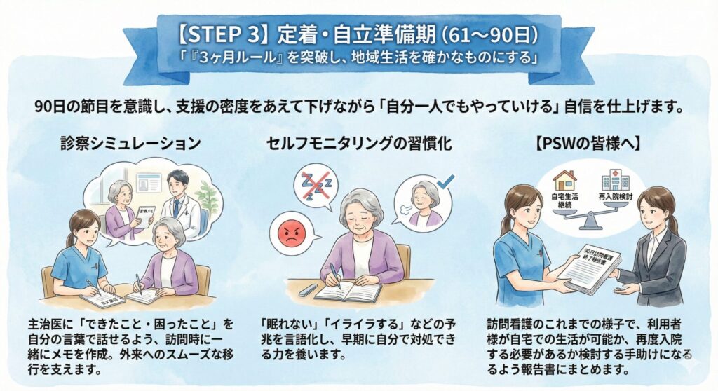 STEP 361〜90日定着・自立準備期90日総括・自立計画、および不調時の主治医連携