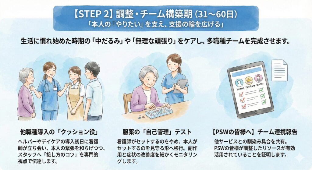 STEP 231〜60日調整・チーム構築期服薬の自己管理移行、他サービスとの連携調整