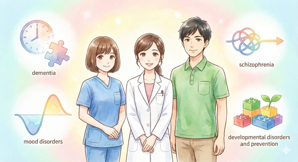 私たちは精神疾患や認知症のケアに特化しており、以下のような疾患・症状の方をサポートしています。